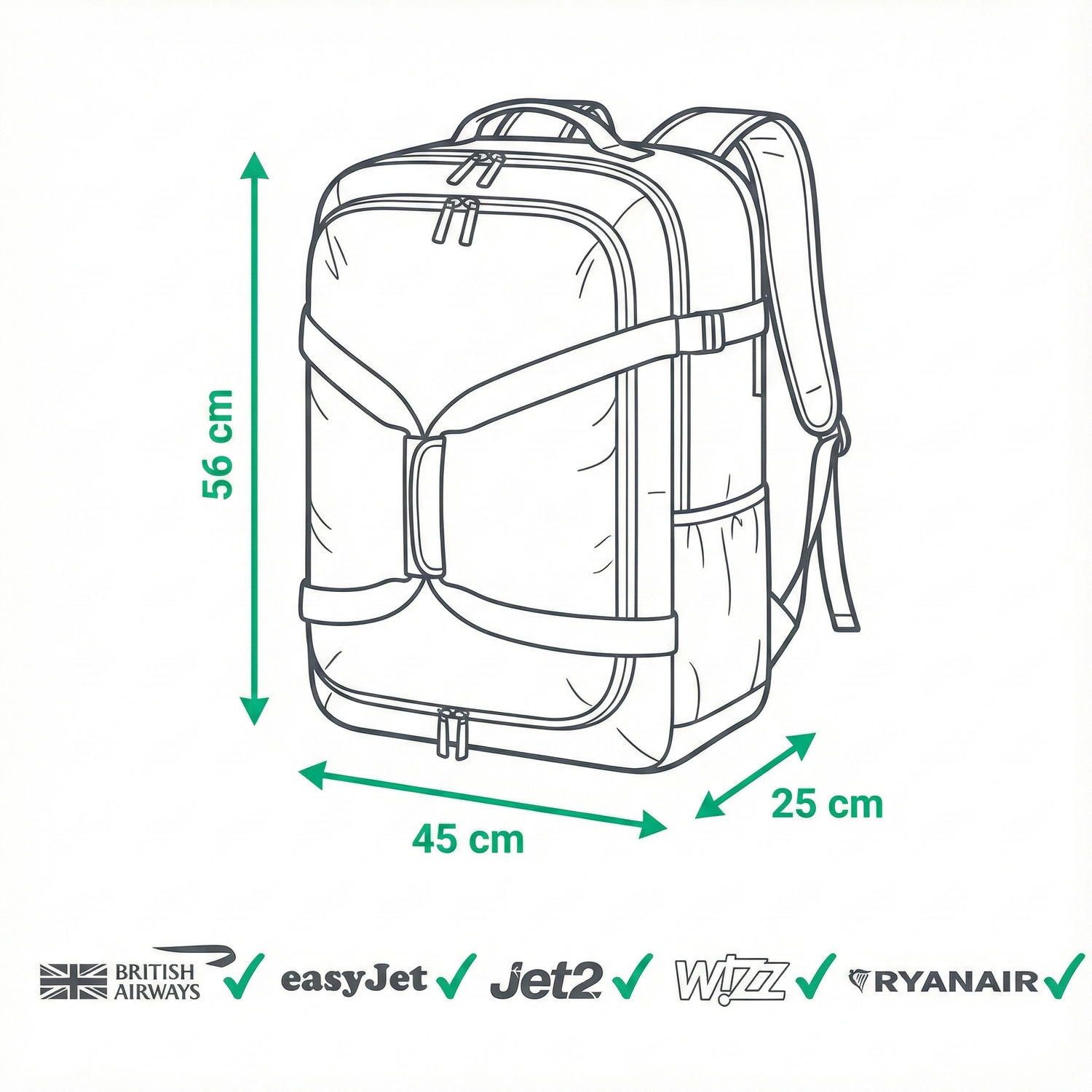Across Europe, many airlines accept cabin bags 56×45×25, making this size perfect for travellers who move between cities or countries regularly. From London to Paris, Manchester to Barcelona, or Edinburgh to Berlin, this format keeps your belongings safe, accessible and well-organised throughout your journey. It eliminates waiting times at baggage carousels, reduces costs, and increases efficiency for travellers who value speed and simplicity.
