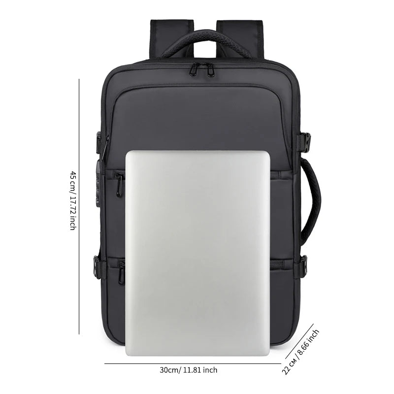 The backpack includes an airtight compression chamber. Once your clothes are inside, you attach the included pump and remove the air in a few seconds. As the air leaves, your clothes flatten and lose up to 30–50% of their volume, giving you much more space without adding weight.