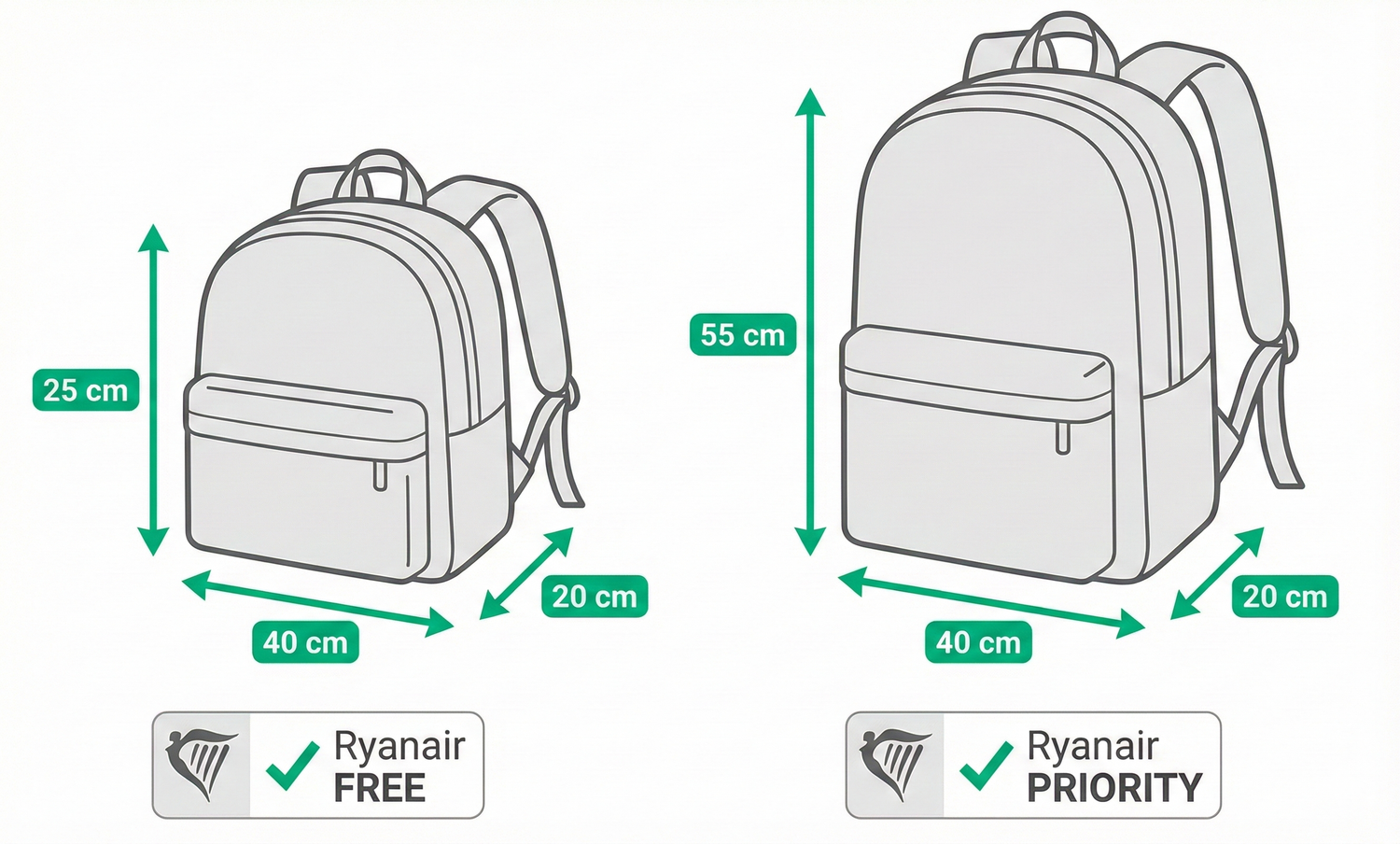 For travellers who need a bit more room, the Ryanair 10kg cabin bag offers the flexibility of a larger carry-on without switching to hold baggage. This option allows you to pack for longer trips while still boarding with priority. Measuring up to 55×40×20 cm, the 10kg format is ideal for those who want extra clothing, shoes or accessories while keeping costs low and avoiding luggage delays.