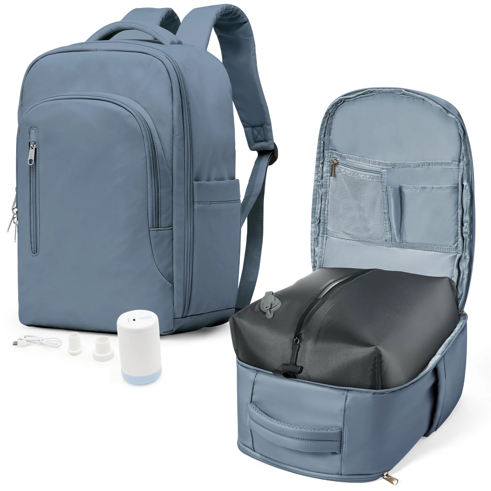 The backpack includes an airtight compression chamber. Once your clothes are inside, you attach the included pump and remove the air in a few seconds. As the air leaves, your clothes flatten and lose up to 30–50% of their volume, giving you much more space without adding weight.