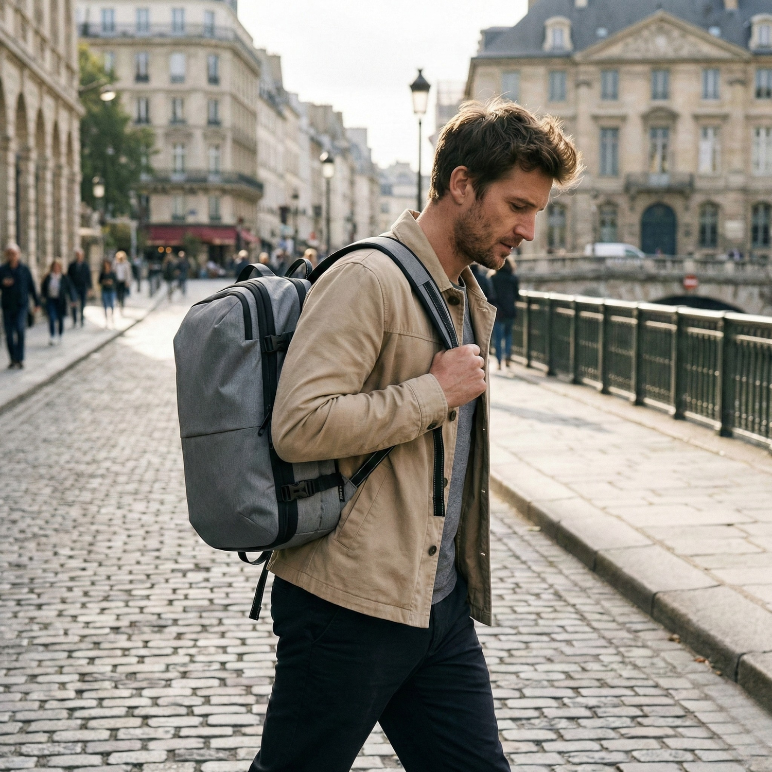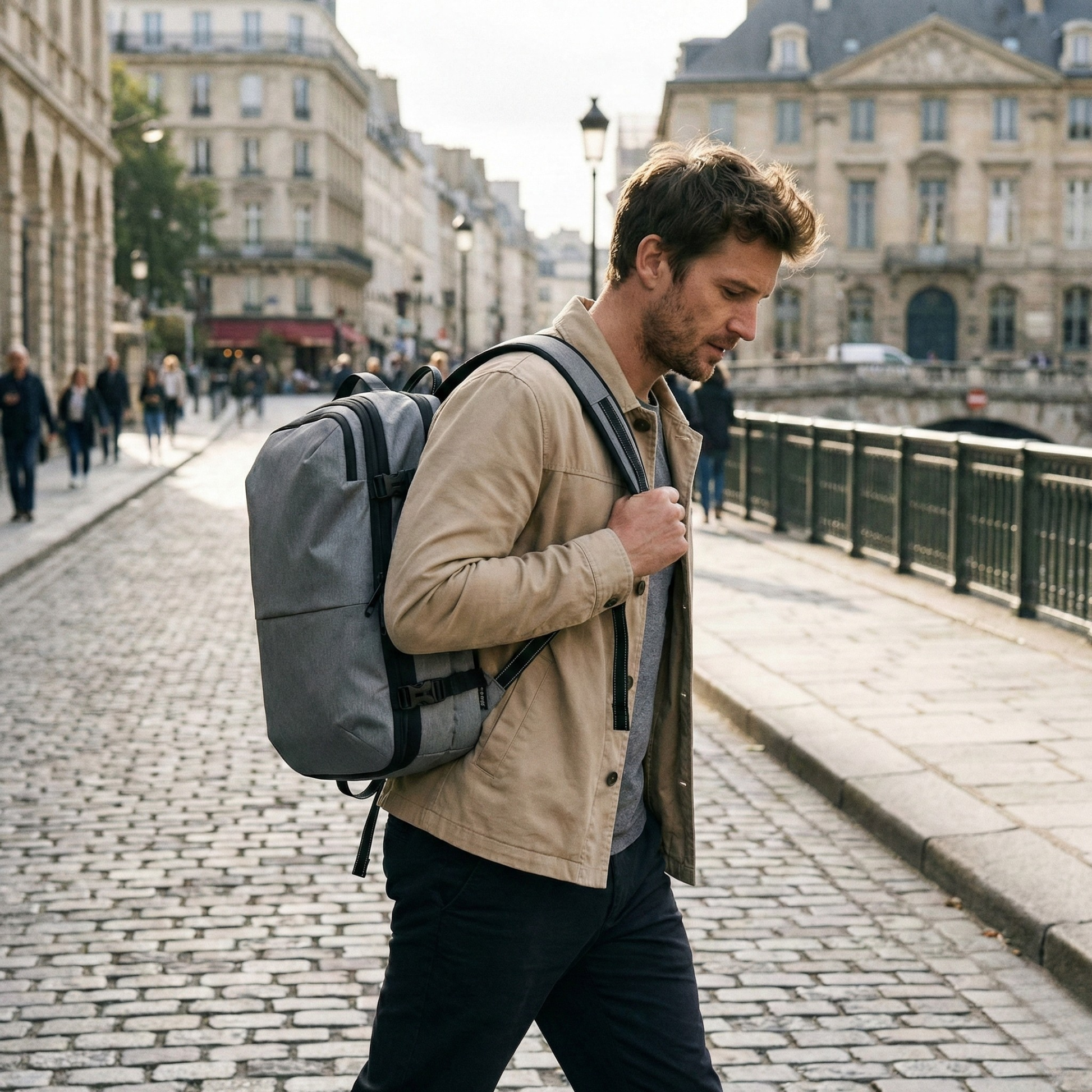 Once compressed, you can easily add extra clothing and accessories on top of the vacuum compartment, using the remaining space as a bonus. The backpack also features dedicated and independent compartments for your laptop, dry zones designed to protect against humidity, and quick-access pockets for essentials like your passport, wallet, and travel documents always within reach.