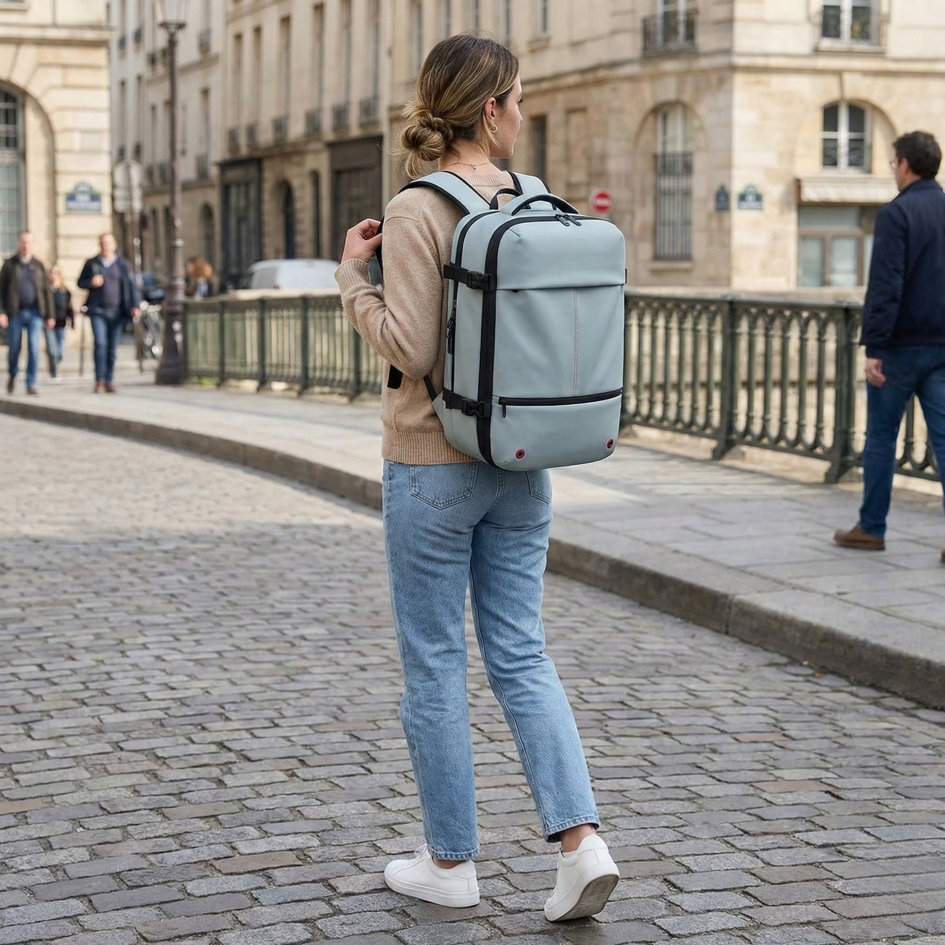 Optimised for space efficiency, this backpack features breathable back padding, comfortable foam shoulder straps and an anti-theft zipper pocket at the back. The compression liner allows you to pack clothes, seal the airtight zipper, open the one-way valve and press out excess air — activating the full 40 L capacity without exceeding airline limits. A dedicated 16-inch laptop sleeve, wet-and-dry compartment and internal organisers keep every item protected and easy to reach.