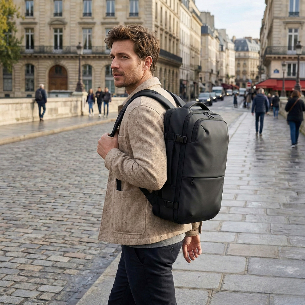 This black version stands out for its ultra-lightweight feel, generous expandable volume and suitcase-like opening. Fully compliant with the 45×36×20 EasyJet format, it offers a premium blend of practicality, durability and modern minimalist design